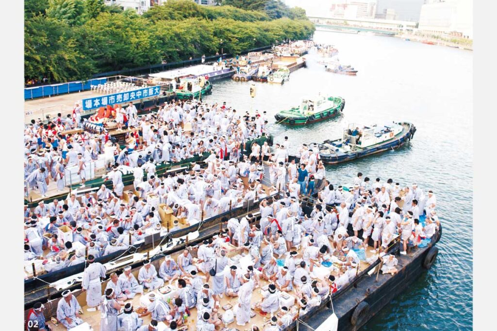 陸渡御の一行は、天神橋に到着すると船に乗り込み大川へ。御神霊を乗せた御鳳輦奉安船やそれを出迎える御迎え船など、100隻以上の船が川面を往来する。随所で行われる、掛け声とともに手締めを交わす「大阪締め」も名物。