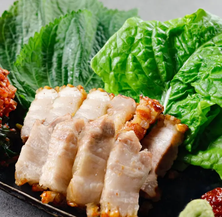 「サムギョプサル 韓国料理 バブ 梅田店」の看板メニューは、15種類の野菜で包んで食べるヘルシーな「サムギョプサル」ですが、他のメニューも豊富です。