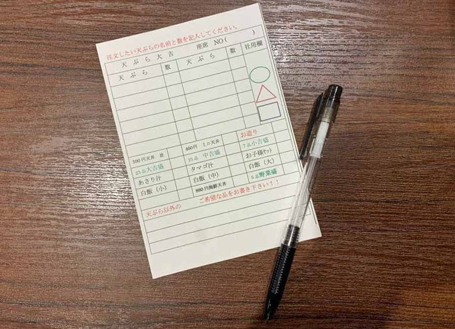 座席に着いたら、テーブルの上に置いてある注文用紙に自分で食べたいものを記入します。書き終わったら、スタッフの方に声をかけて、注文をお願いしましょう。たくさんのメニューの中から、じっくり食べたいものを選びましょう。