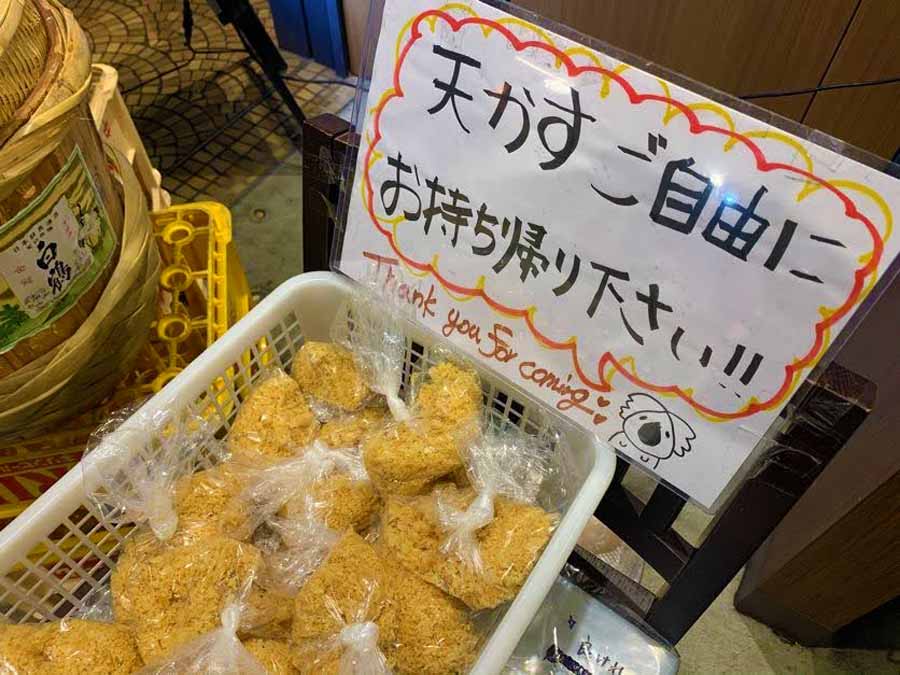 入り口には、お店で天ぷらを揚げる際に出た天かすが置かれています。自宅に持ち帰って、うどんに入れたり、お好み焼きに使ったり、衣もおいしいと評判の大吉さんの天かすは嬉しいおみやげですね。