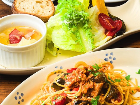 ランチタイムのおすすめは「パスタランチ」1,600円。色鮮やかな前菜盛合せに、本日のパスタとパン、食後のドルチェとカフェがついた嬉しいセットです。プラス1,000円でメイン料理を加えて、シチリアワインとともにいただくランチもいいですね。お腹がいっぱいになったあとは、お店近くにある服部緑地をのんびりお散歩すれば、極上のシエスタ(イタリア語で昼休憩の意)が楽しめそうです。