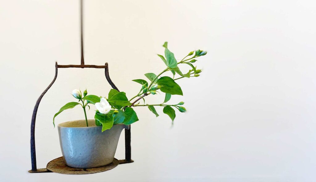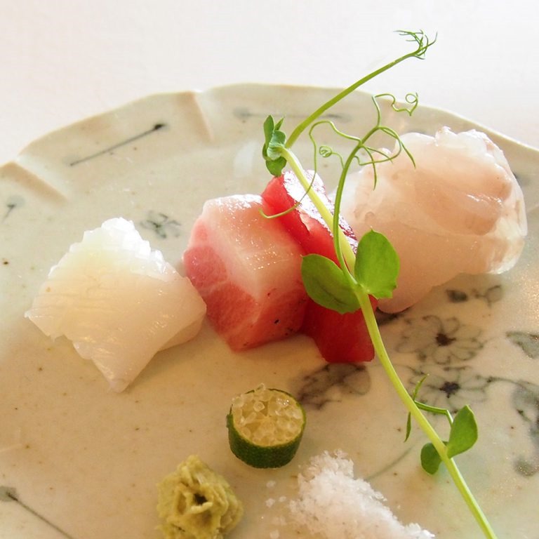 阪急宝塚線岡町駅から徒歩10分ほど桜塚高等学校の北向かいにある、白い暖簾がさりげない趣の「料理屋くおん」。店内は色みを抑えた極めてシンプルなインテリアで、つつましやかな生花や器の一つひとつもすべてが洗練されているミニマムな空間。料理を引きたてる、徹底した内装は奥ゆかしさすら感じます。