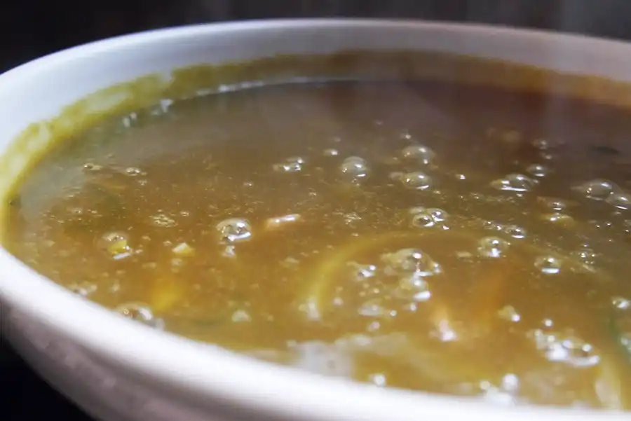 注文すると、席に運ばれるのは器になみなみとカレーのルーが入ったうどん。くつくつと湯気が出ていて、猫舌の人は熱くて辛くてなかなか食べることができません。そんな時は小鉢に少しずつ移しながら食べるのがおすすめです。