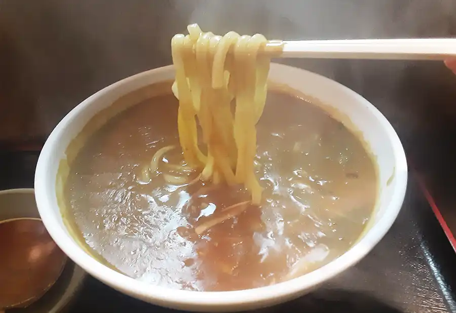 「番馬亭」のカレーはただ辛いというより、出汁の香りがしてスパイシーでどこかクリーミー。食べ始めると寒い時期でも汗をかくほどですが、カレーうどんはこうでなくっちゃね!