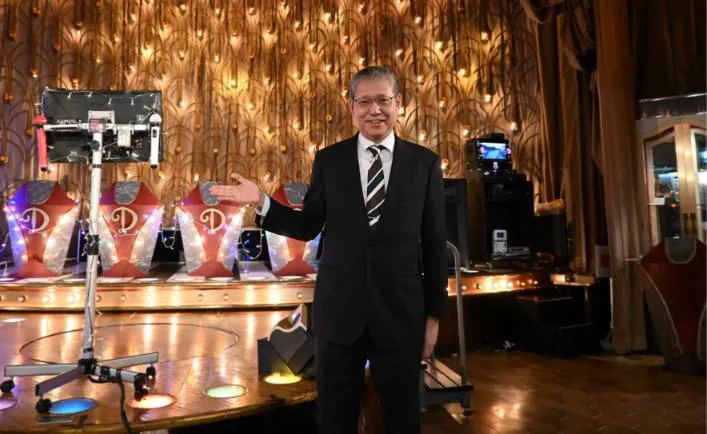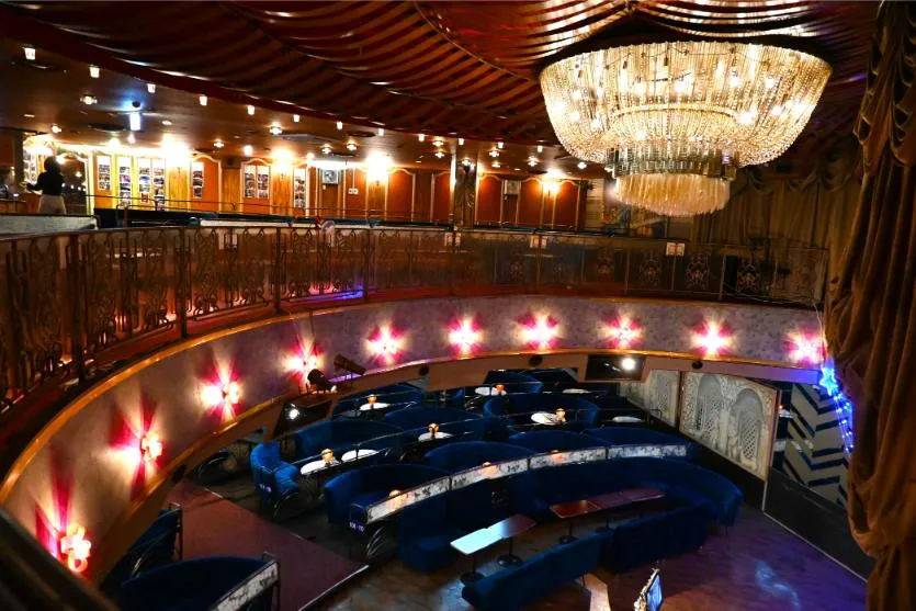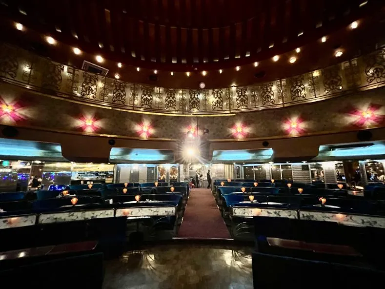 歩みを進めると、大空間が目の前に広がる。電飾に縁取られてキラキラと輝くステージ。手前には、そのステージを扇形に囲むようにソファが並び、奥には、数十もの電球がちりばめられた重厚な舞台幕がしつらえられている。