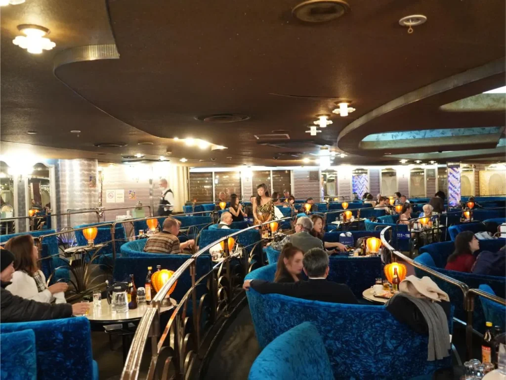 ステージに近づくと天井が高くなり、視界がパッと開けた。高さ6メートルの頭上に、直径2メートルはありそうなシャンデリアがきらめく。これがキャバレーか……。ラグジュアリーな内装に圧倒され、しばらく天井を見上げながらうっとり。