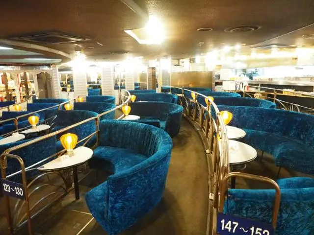 ステージ上からの眺めも、これまた壮観。今は使われていない2階の客席まで吹き抜けになった空間に、さまざまな色や形のライトが輝く。劇場のように、ステージに向かって全ての客席がレイアウトされ、床にも緩やかに傾斜がついている。ここに立つと、全員の視線を集められる仕掛けだ。宮田さんによると「ステージで歌うカラオケが、お客様からも好評なんですよ」とのこと。