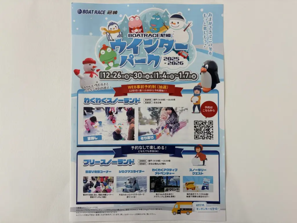 阪神尼崎センタープール前駅から約3分の「ボートレース尼崎」で、子どもが雪遊びできるイベント「ウインターパーク 2025▶2026」が開催されます!予約なし、無料で遊べるコーナーも充実しています。
