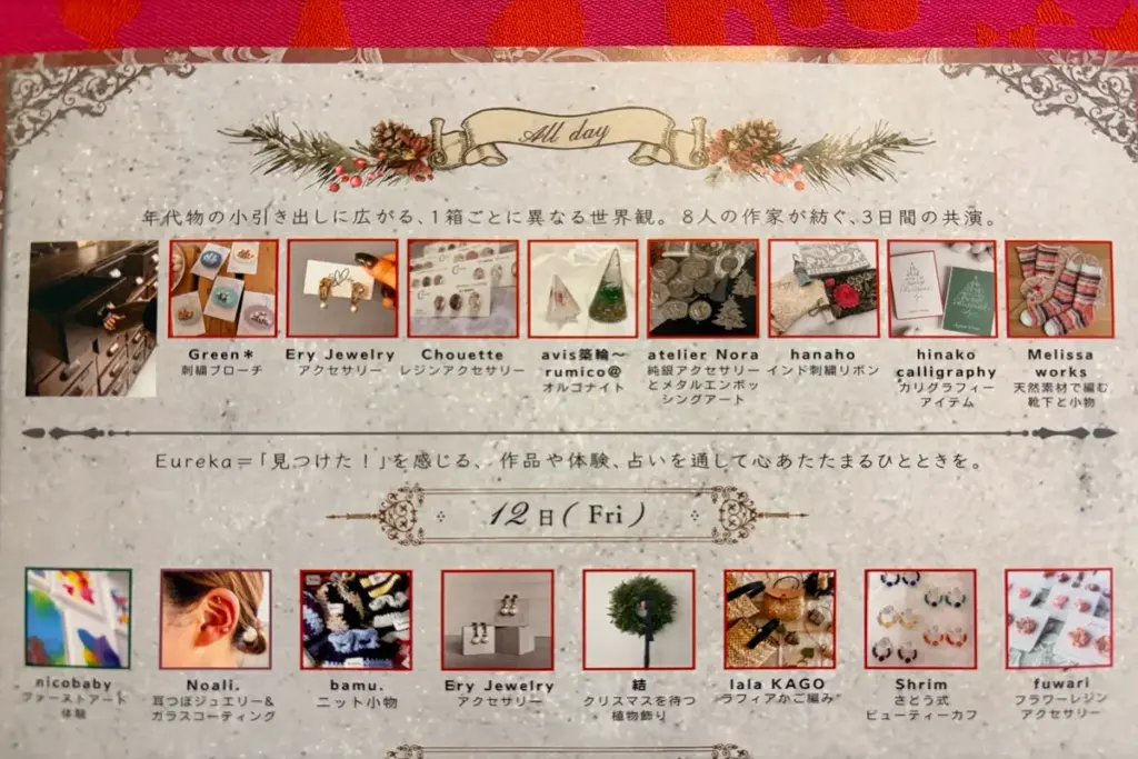 3日間を通して、アンティークの引き出しに8人の作家さんの作品が並ぶそう。さらに、初日の12日(金)はアクセサリーやニット小物が登場するようです。誰かを想ってのプレゼント探しもぴったりの時間になりそうですね。