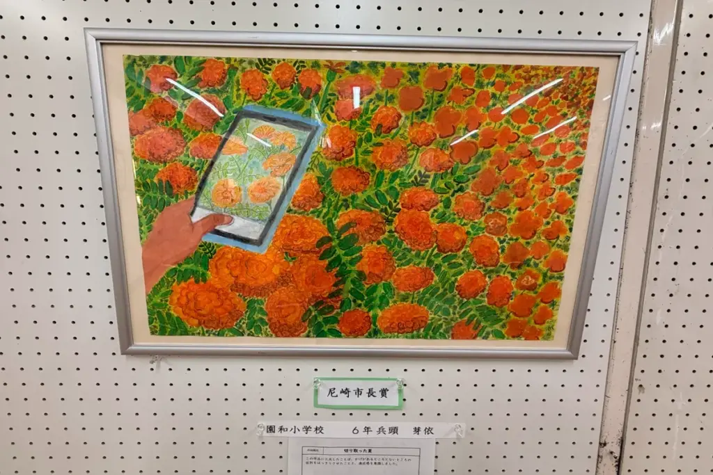 さまざまな賞が設けられているなか、尼崎市長賞は一面に咲き誇るお花をスマートフォンで撮るシーンを描いた六年生の作品でした。ギャラリーのみなさんから「イマドキの設定でいいね!」と感心する声が漏れ聞こえてきました。