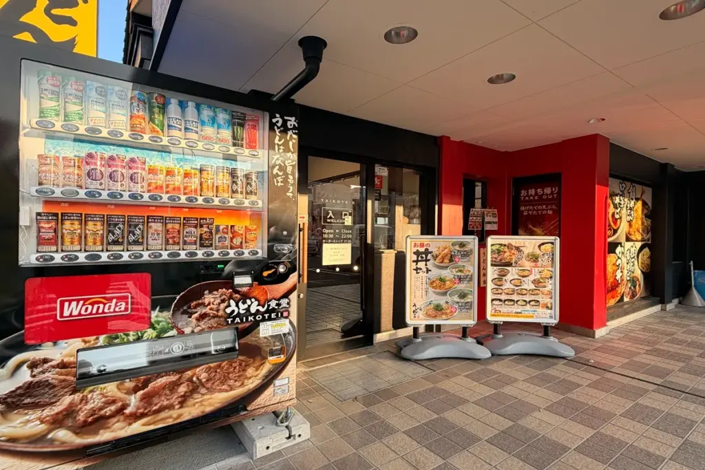 入口付近には、「うどん食堂TAIKOTEI」のロゴが入ったオリジナルラッピングの自動販売機が設置されていました。「おだしが旨もうて、うどんはなんぼ」の文言に、ほっとするおだしの味わいが恋しくなります。