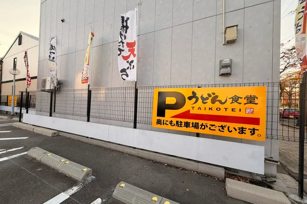 駐車場も、リニューアル前と変わらず広々としています。正式名称は「うどん食堂太鼓亭」のようですが、アルファベット表記もあるみたい。
