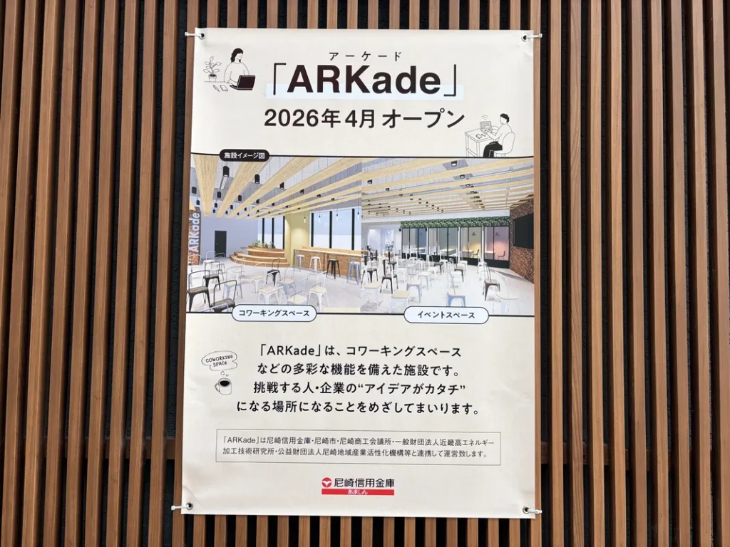 近付いてみると、こんな貼り紙がありました。コワーキングスペースとイベントスペースを有する新しい施設「ARKde(アーケード)」が26年春にオープンするようです。挑戦する人・企業の”アイデアが形”になる場所を目指すというメッセージが記されています。尼崎で働く人や住民の活躍を支えてくれる新たなスポットの誕生に期待が高まります!