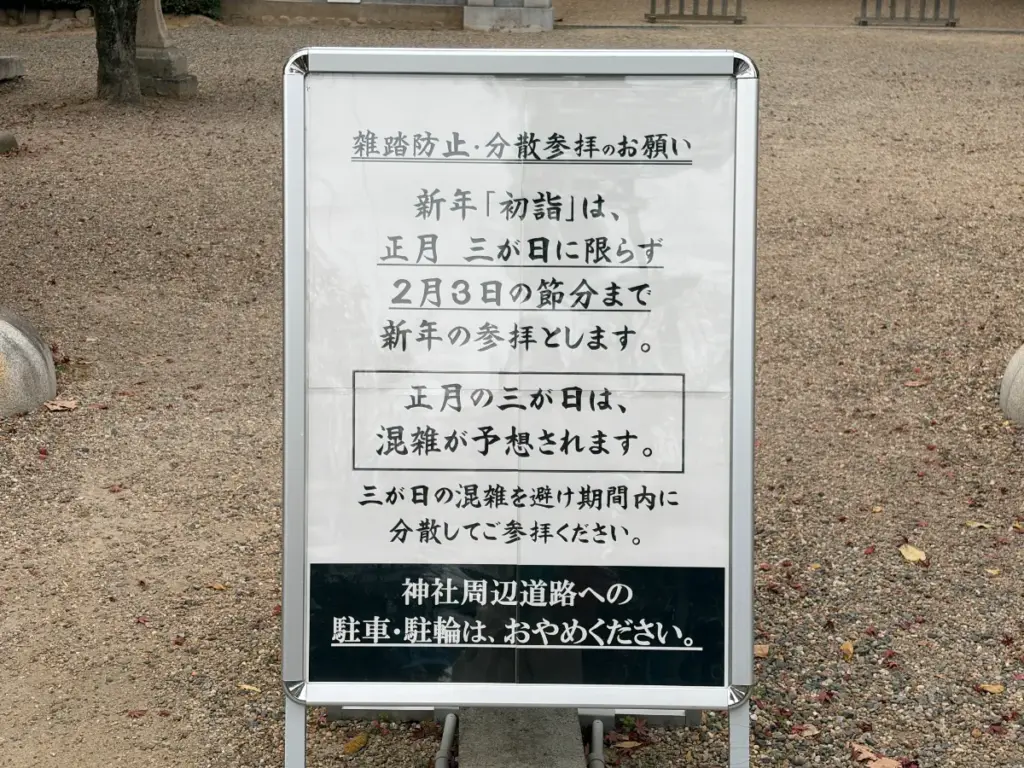 お正月の三が日は毎年混雑するため、このような立て看板がありました。新年の参拝が2月3日(火)までと知るとゆったり構えられますね。なるべく分散して参拝しましょう。また、お正月の三が日など行事のある日は駐車ができないため、徒歩でおでかけください。