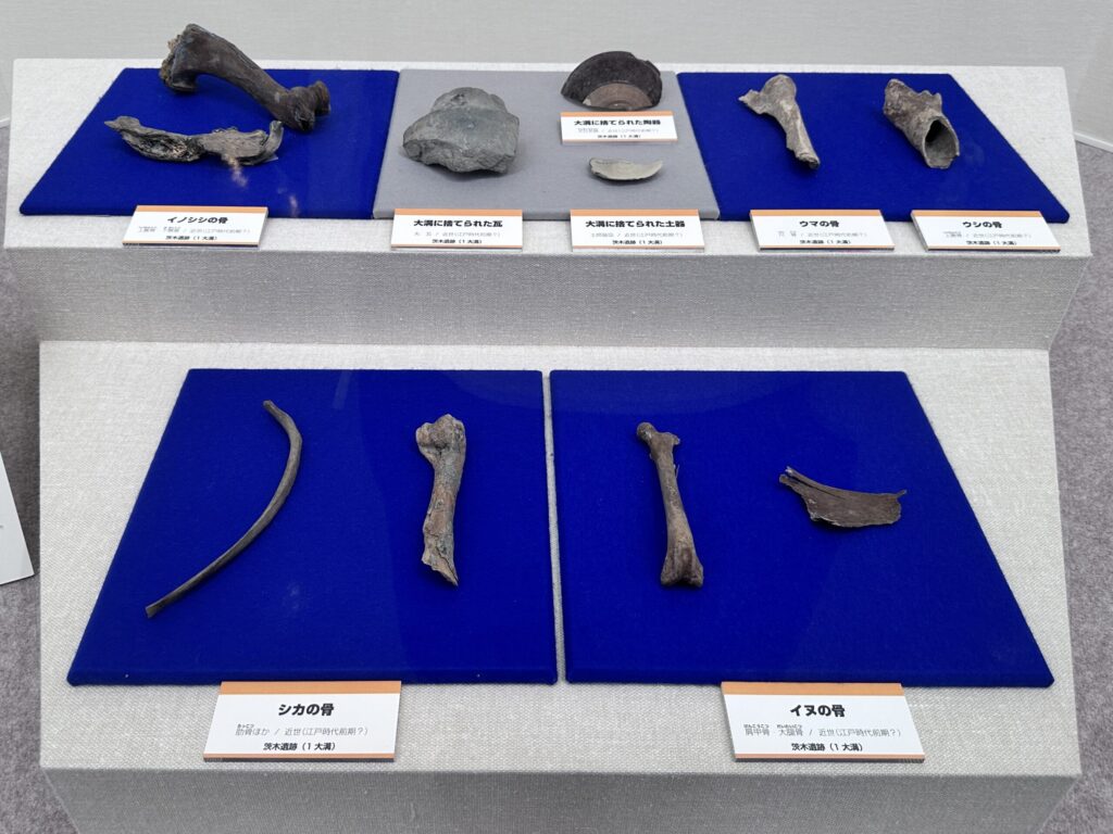 二つめは、茨木遺跡です。ここは阪急茨木市駅の西側にある遺跡ですが、もともと茨木城があったのではないかと考えられています。残念ながら茨木城の堀ではなかったのですが、堀から牛、馬、鹿、猪、犬など、たくさんの動物の骨が発見されました。牛や馬は農耕に欠かせなかったと考えられていますが、今でいうジビエのように食べていた動物もあるのかもしれません。