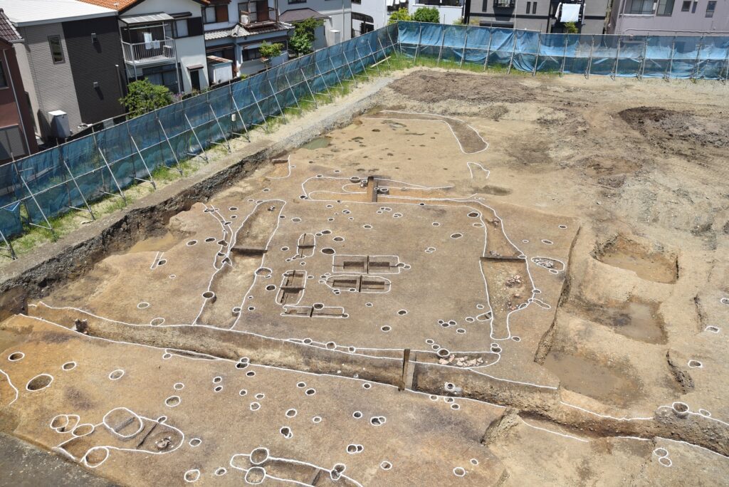 三つめは群遺跡です。名神高速道路茨木インターチェンジの南側付近にある古墳ですが、なぜか古代に大きな溝が掘られていたそうです。V字型にとても深く彫られた溝。用水か灌漑用の水なのかは分かりませんが、古墳を壊すほどの必要に迫られていたと考えられています。