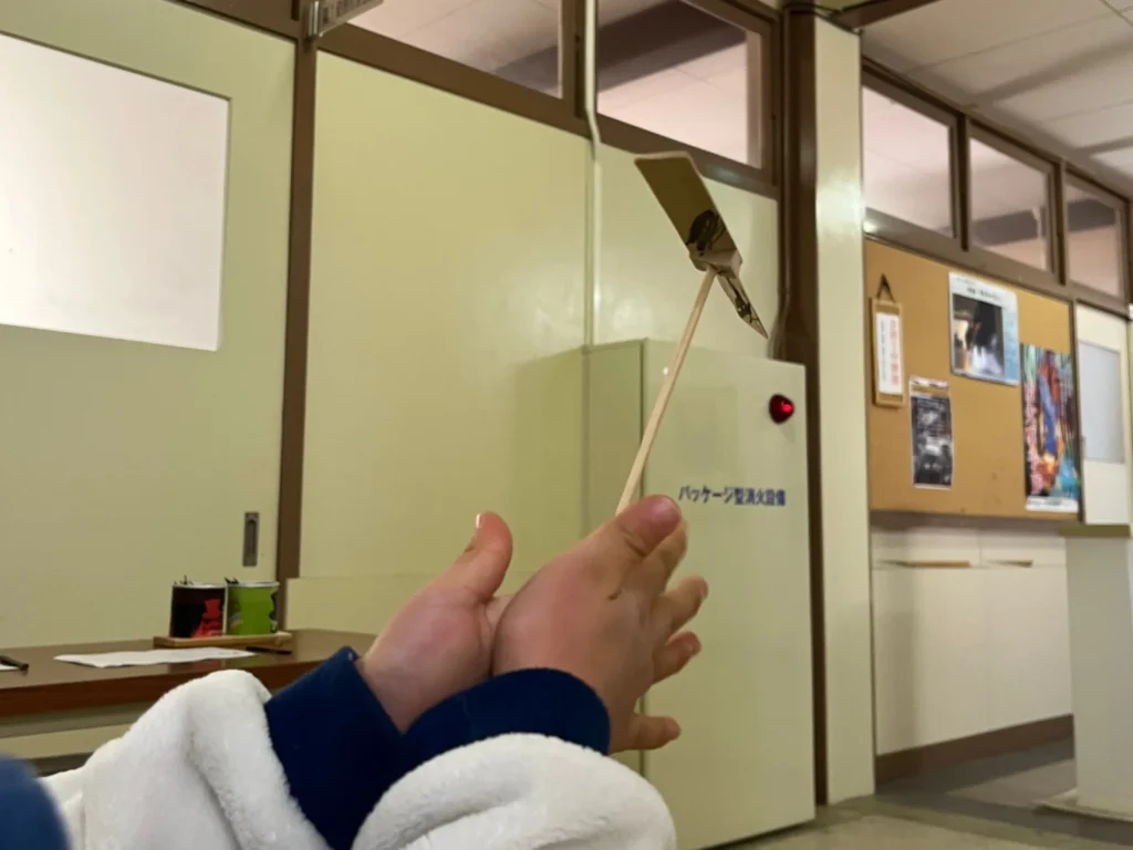 外に出て、凧揚げをしたりして楽しみました。凧の持ち手は木を使用しています。