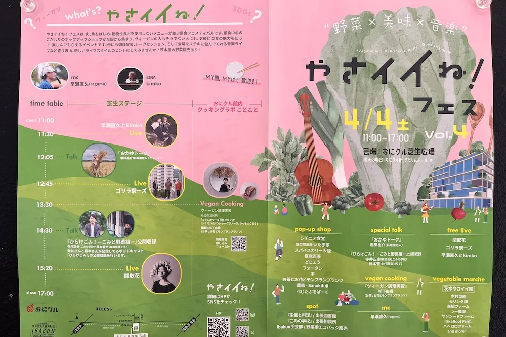2026年4月4日、茨木市のおにクル芝生広場で、菜食の魅力を気軽に楽しめるイベント「やさイイね!フェス」が開催されます。