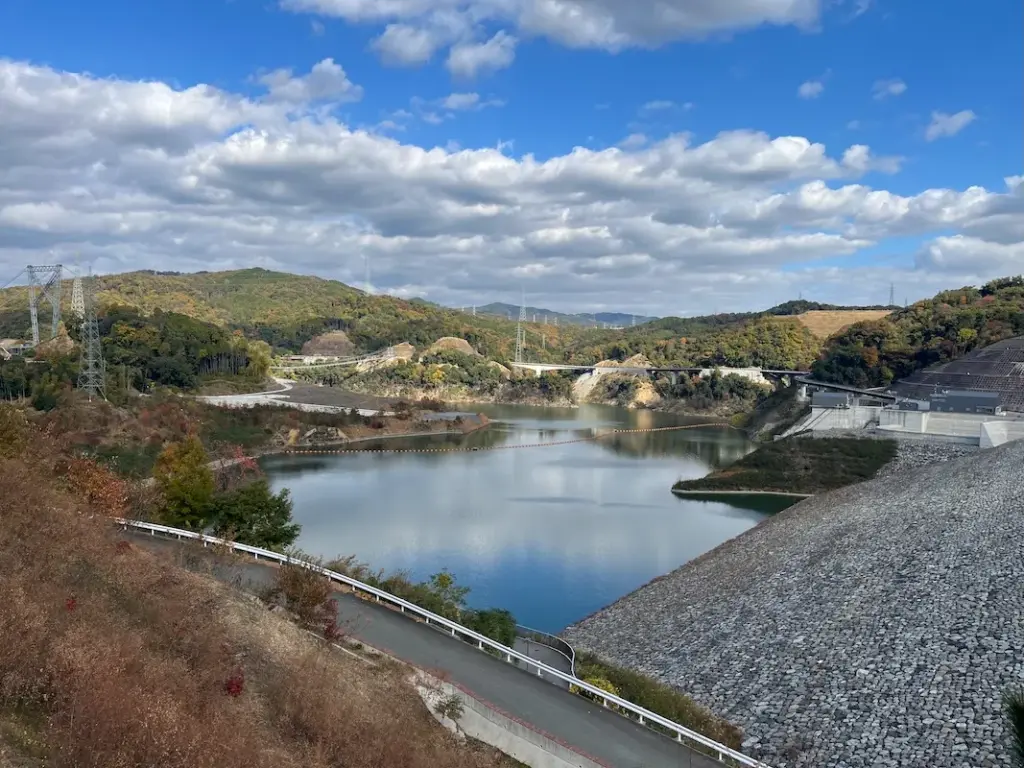 本堂の周辺を歩くと、そこには安威川ダムがありました。ダムパークの吊り橋やダムパーク風の丘ゾーンの方も見渡せます。最もきれいに安威川ダムを見渡せる場所ではないでしょうか。