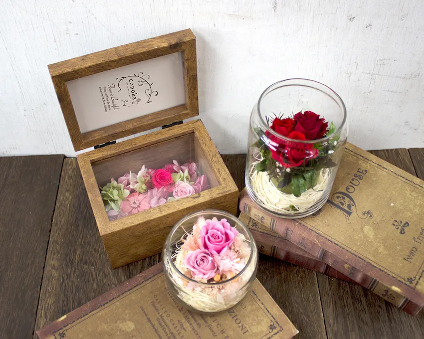 さらに、長く美しさを保つプリザーブドフラワーや、お花を閉じ込めたインテリア雑貨も充実。木箱やガラスドームに収められた小さな花の世界は、ずっと大切にしたい思い出の品になりそうです。