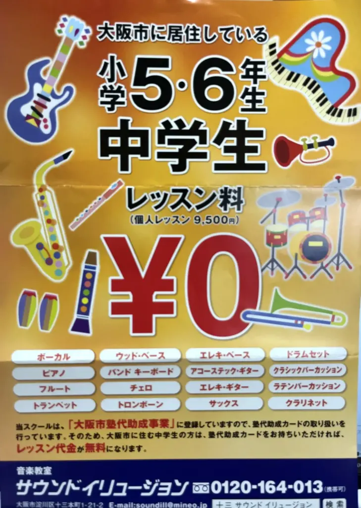 「サウンドイリュージョン」は、「※大阪市塾代助成事業」に登録しているため、大阪市内在住の小学5年生~中学3年生は、「塾代助成カード」を持参すると個人レッスン料9500円が無料になります。