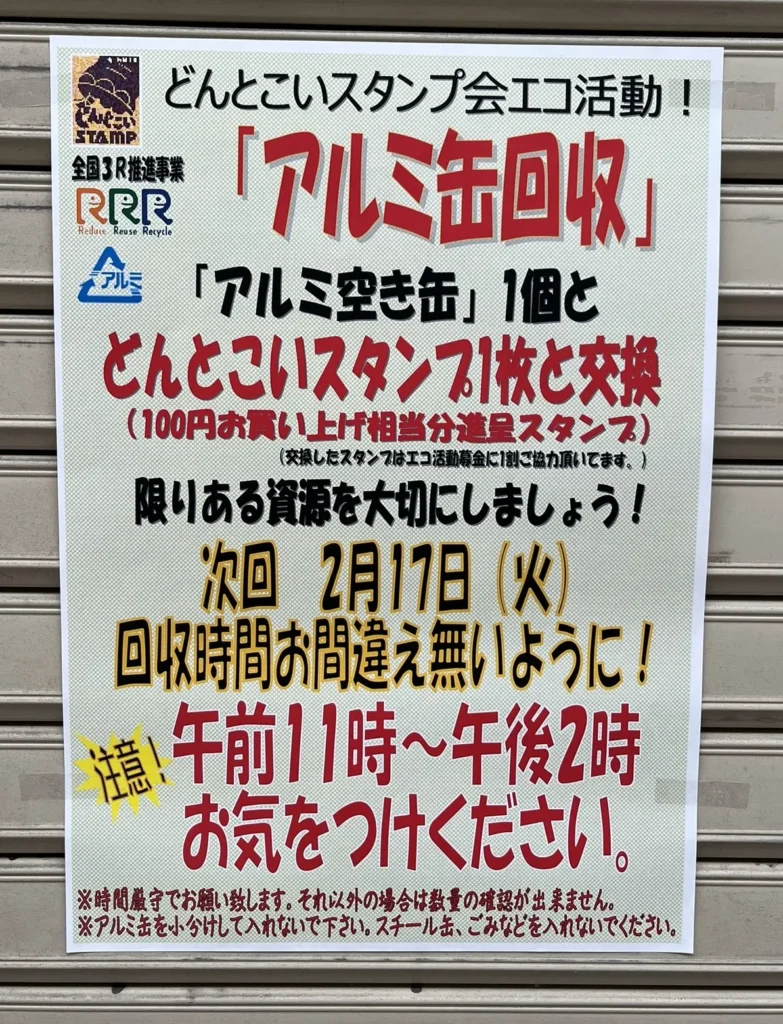十三もといまロード商店街(十三元今里商店街)」で運営されている「十三もといまロードどんとこいどんとこいスタンプ会」では、アルミ缶回収を定期的に実施しています。