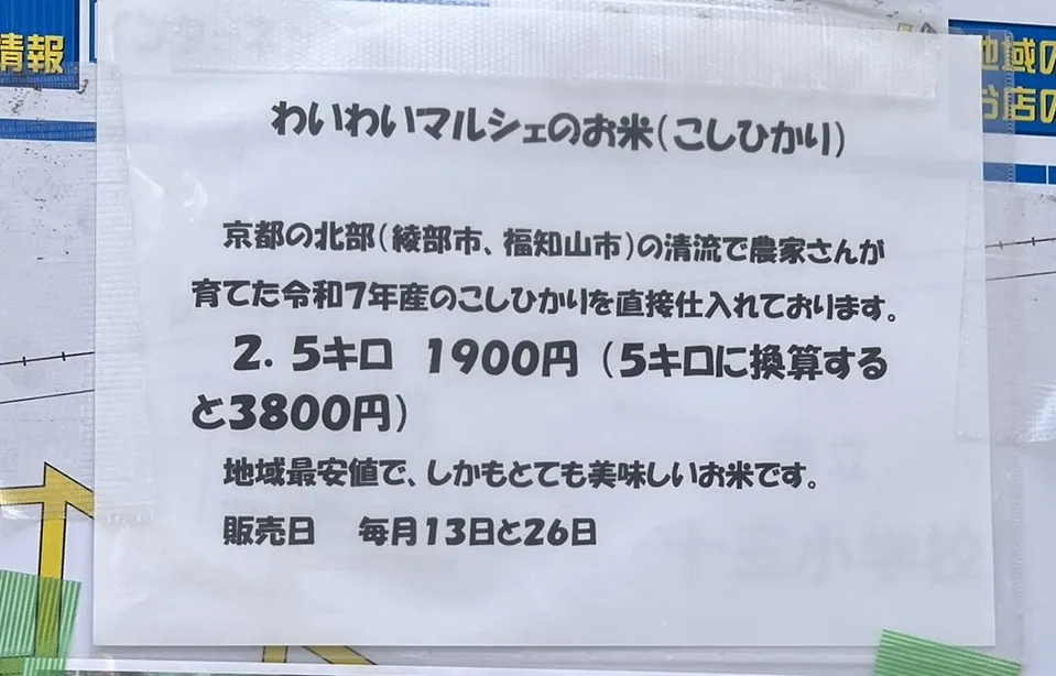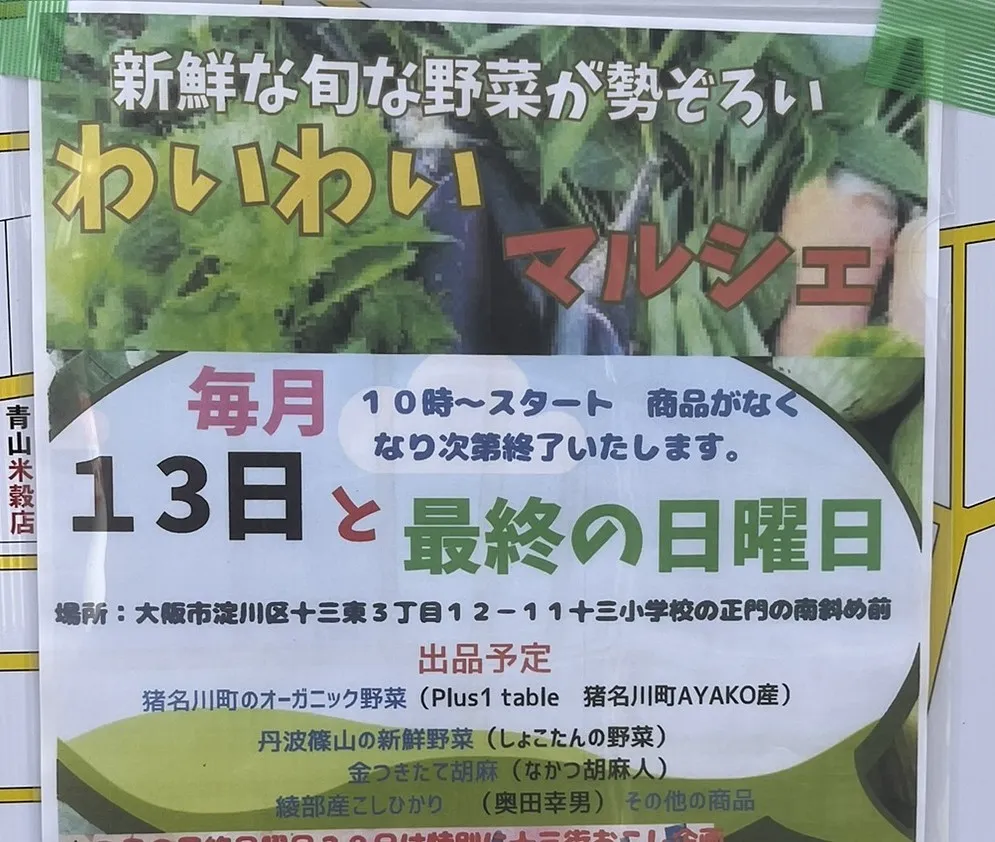 十三東本通商店街(つばめ通り)内、十三小学校の南斜め向かいで開催されている青空市「わいわいマルシェ」。新鮮な旬の野菜や食材がずらりと並び、地域の人たちでにぎわう人気のマルシェです。毎月13日と最終日曜日の10時からスタートし、商品がなくなり次第終了となります。