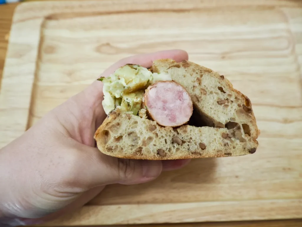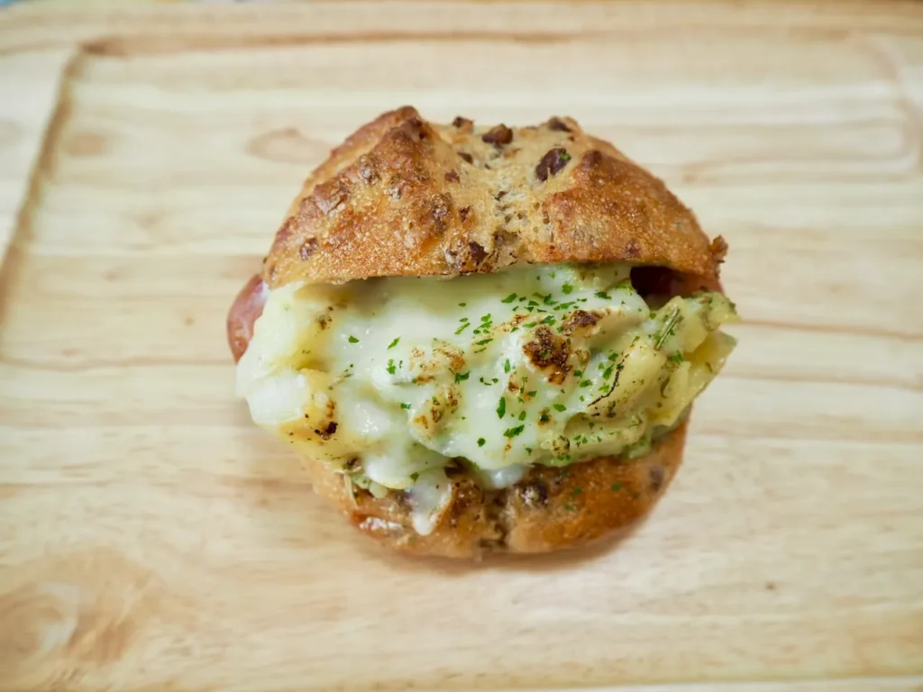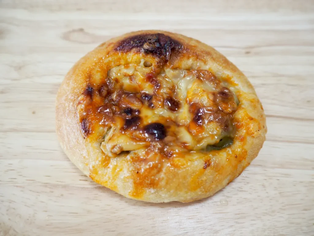 特徴: 自家製ホワイトソースとハーブソーセージをサンドし、コーンとマヨネーズ、チーズを乗せて焼いた大人気の商品です。