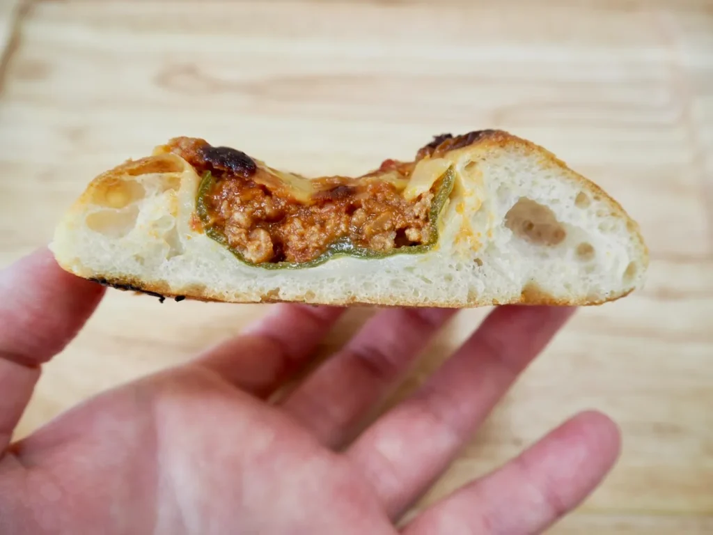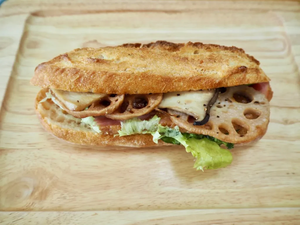 特徴: かなりハードなバゲットに分厚い乾燥ベーコングリルにレンコン、エリンギ、肉みそがサンド