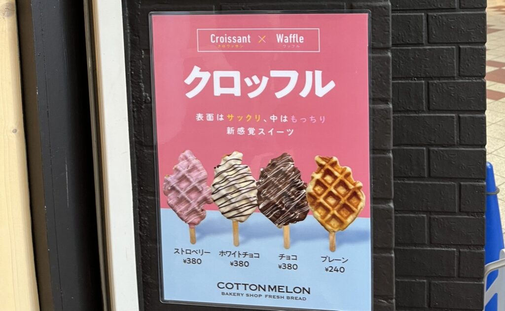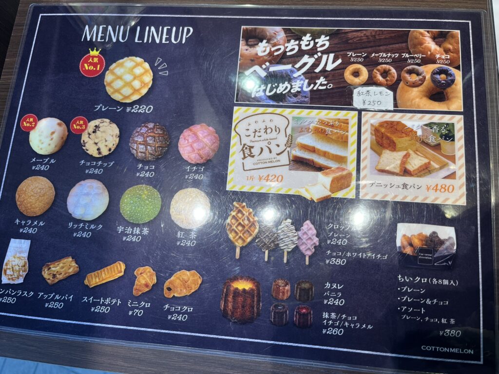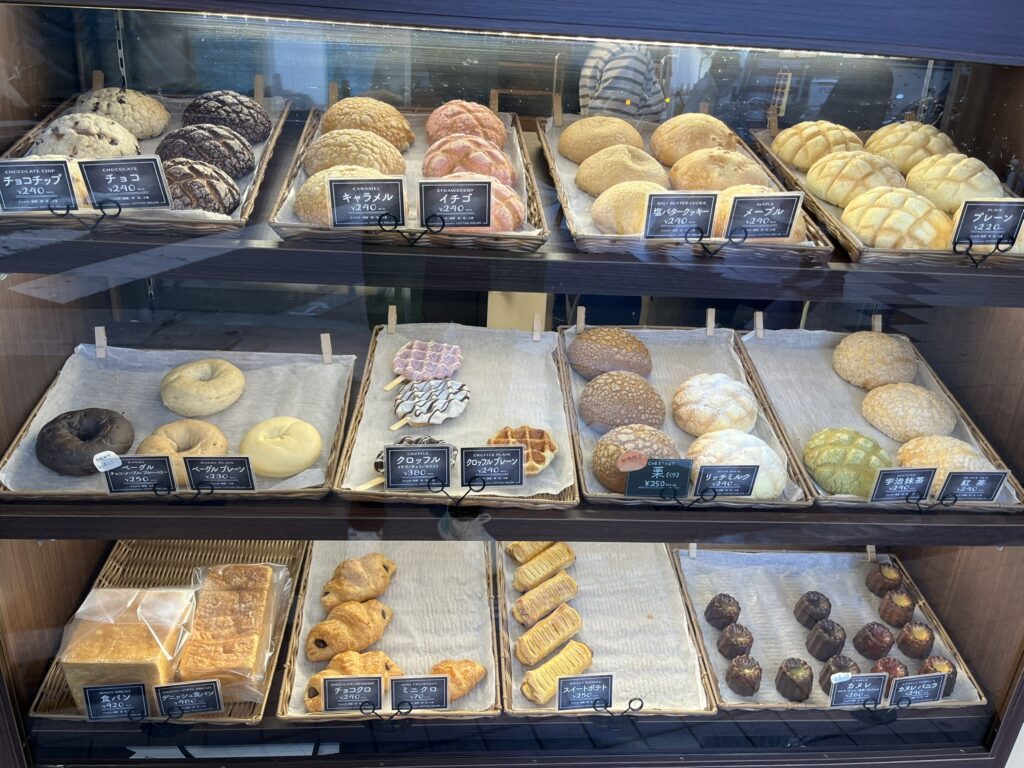 店頭のショーケースには、焼き立てのメロンパン以外にも、ベーグル、クロッフル、ワッフル、スイートポテト、食パン、カヌレ……などバラエティ豊かな商品が並んでいて目を奪われます。