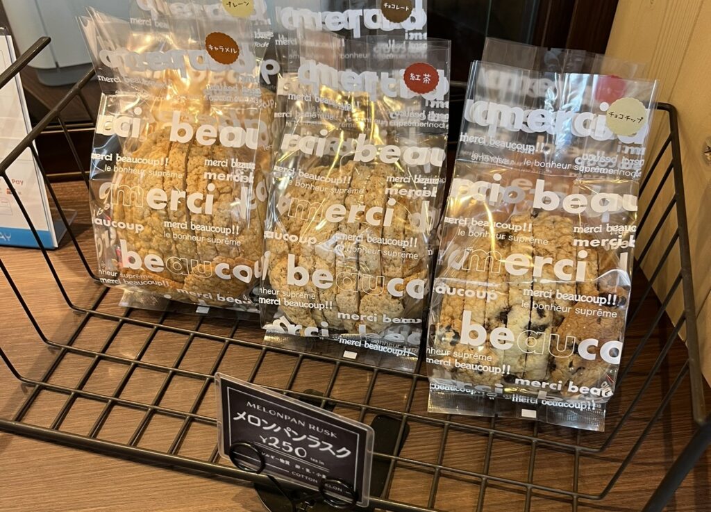 サクサクふわふわの焼き立てメロンパンのラインアップは全9種類。ちょっとしたおやつにピッタリなメロンパンのラスク250円も各種フレーバーが揃っていました。