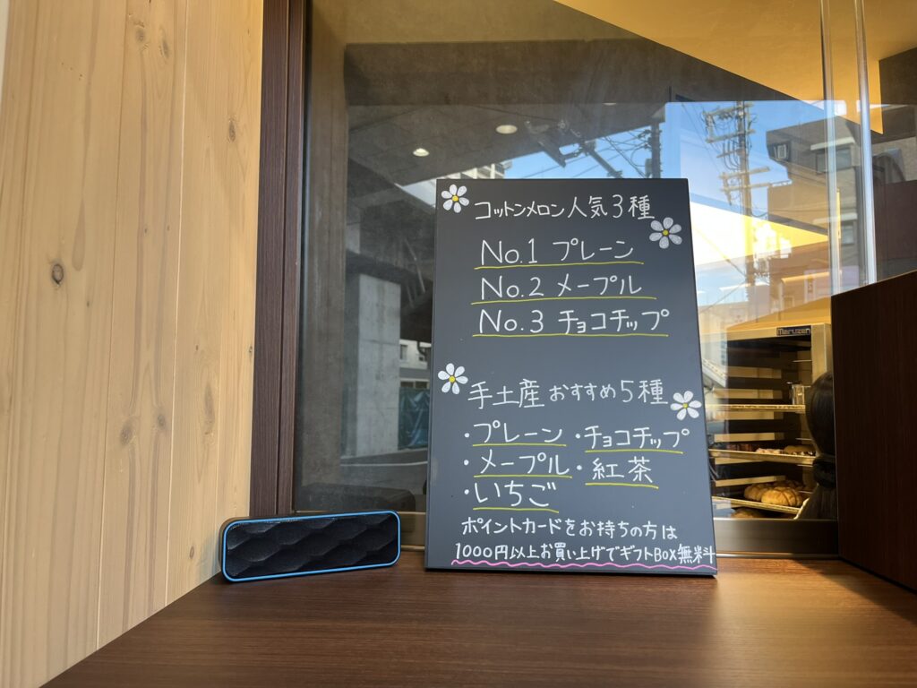 メロンパンの人気ランキングが掲示されていました。1位がプレーン、2位がメープル、3位がチョコチップとなっています。ポイントカードを作ると1000円以上のお買い上げでギフトBOXが無料になるサービスも。お土産購入時はぜひ利用したいですね。