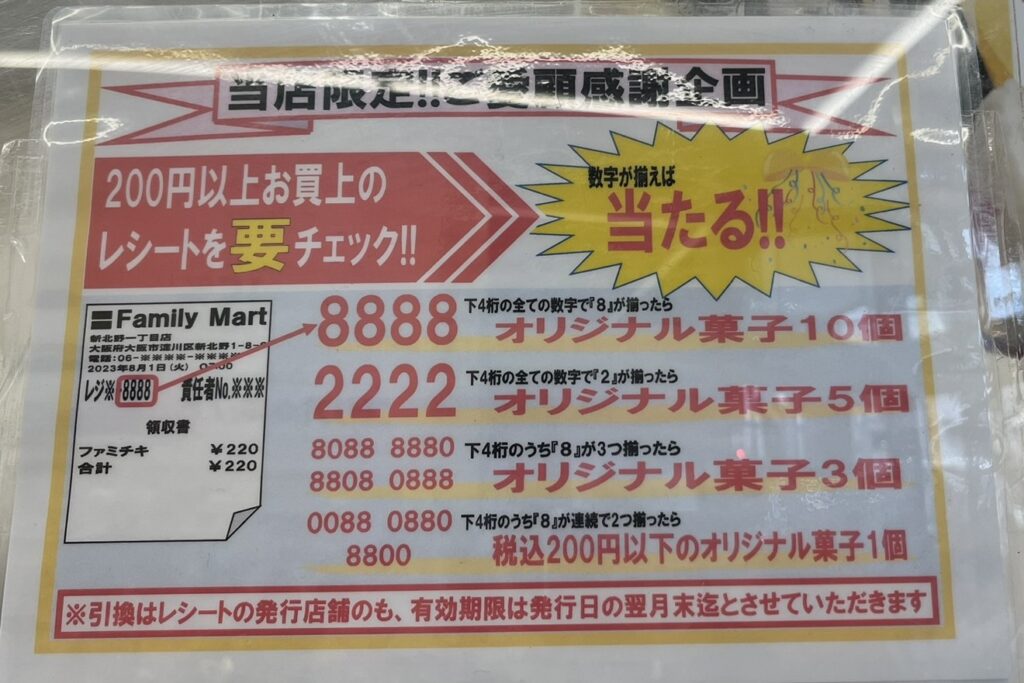 下4桁のうち「8」が連続で2つ揃ったら税込み200円以下のお菓子1個