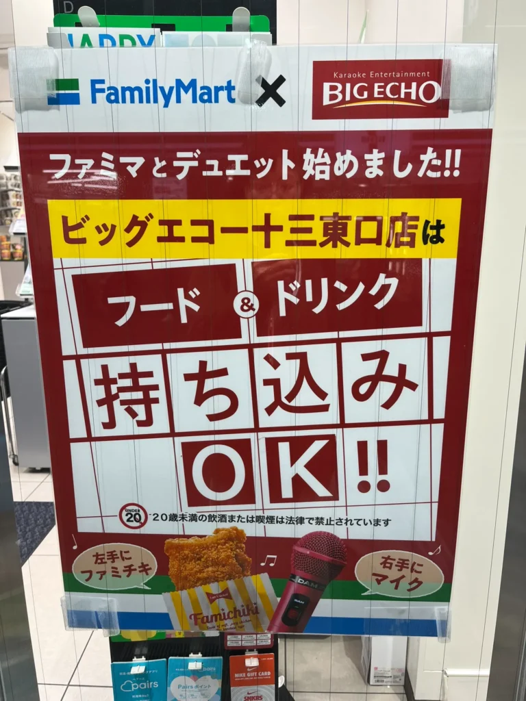 阪急十三駅の東改札口を出てすぐ、徒歩1分のアクセス便利な場所にある「ビッグエコー十三東口店」では、フードやドリンクの持ち込みが可能。すぐ近くにはファミリーマートもあり、「持ち込みOK」のポスターが掲示されていました。