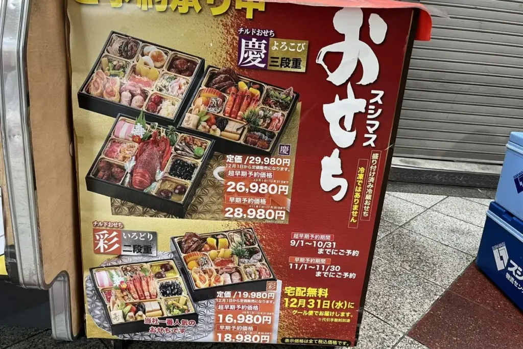 「スシマス十三店」では、現在おせち料理を予約受付中で、豪華食材が華やかな三段重(慶よろこび)と、定番料理を美しく詰めた二段重(彩いろどり)の2種があり、いずれも11月30日までなら早期予約価格にて購入できます。