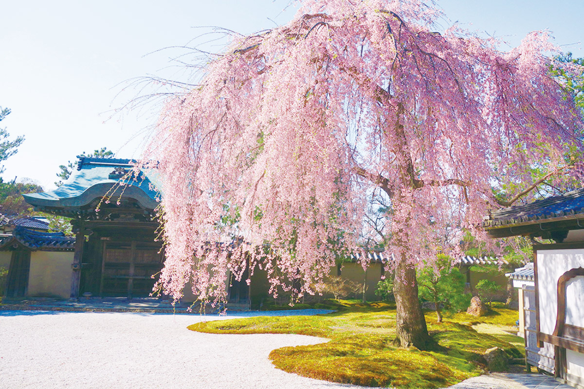 足利尊氏が建立した天龍寺。多宝殿の前の枝垂れ桜の大木が目を楽しませてくれます。春の嵐山を見渡せる望京の丘など、遠近の桜が美しいスポット。