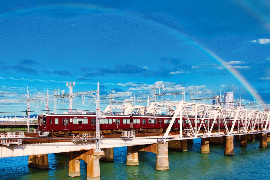 天気は、晴れに越したことはないですが、雨の日にしか撮れない写真も。虹の1枚も雨上がりの瞬間を捉えたものです。天候や季節で異なる阪急電車の姿をぜひ狙ってみてください。