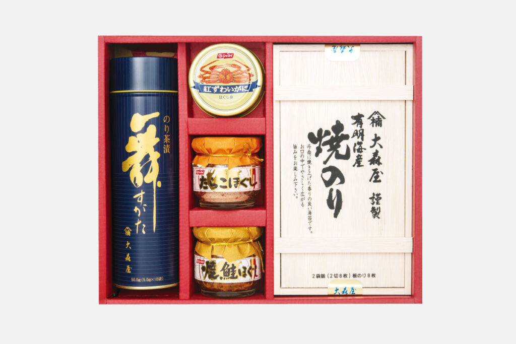 有明海産のりを丹念に焼き上げ、色つや・香りのよいパリッと食感の焼きのりをはじめ、毎日の食卓に彩りを添える、栄養価も抜群のご飯のお供5点セット(舞すがたのり茶漬、焼のり半裁木箱、紅ずわいがにほぐし身、たらこほぐし、焼鮭ほぐし)。