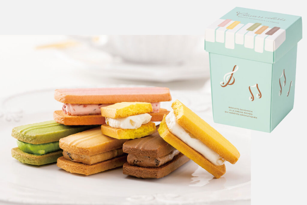 カラフルな鍵盤をイメージした5色のクッキーに、チョコレートやドライフルーツが入ったなめらかなクリームをサンド。おいしくリニューアルした5つのハーモニーを楽しんで。