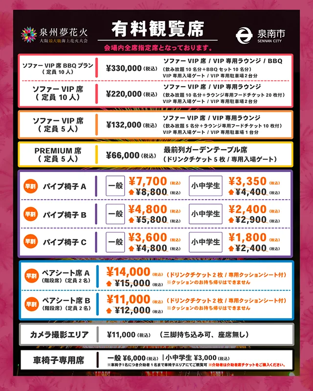 早期購入特典として、通常価格よりも安く購入できる早割キャンペーンを実施! キャンペーンを活用してお得に泉州夢花火を楽しんではいかがでしょう。