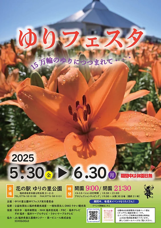 福井県坂井市の花「ゆり」の祭典、「ゆりフェスタ」が5月30日(金)から6月30日(月)まで開催。開催初日のオープニング式典には坂井ほや丸も登場します。