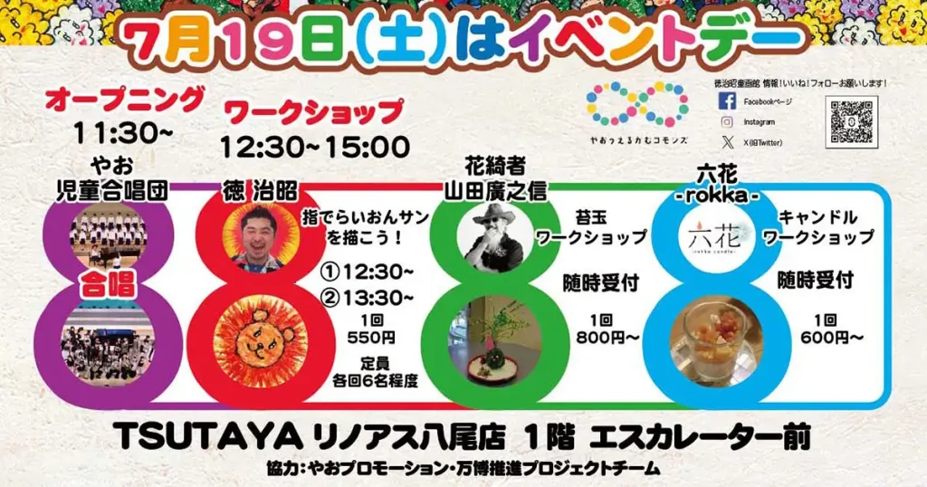 基本在廊なしの展示ですが、初日の7月19日(土)はイベントがあります。11時30分のオープニングでは、「やお児童合唱団」による合唱が。12時30分から15時には3つのワークショップが開催されます。