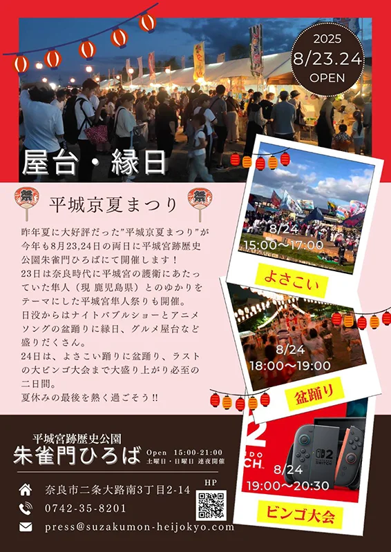 23日には、まず、平城宮の護衛にあたっていた「隼人」とのゆかりをテーマにした「平城宮隼人舞ショー(鹿児島県の伝統舞踊)」が開催。日没からは、アニメソングと盆踊りが融合した「アニソン盆踊り」が実施されます。
