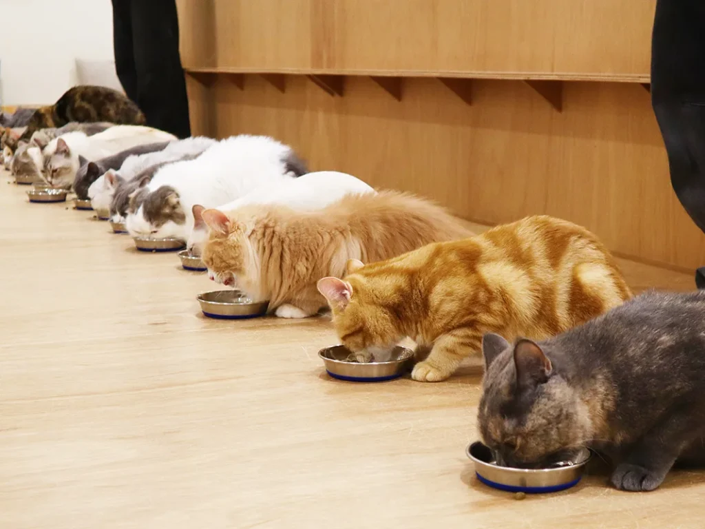 毎日正午と午後 5 時に開催する「ごはんタイム」では、かわいいネコたちのお食事風景が楽しめます。ネコの生体についての知識と経験を兼ね備えたスタッフによる紹介は、ふれあいをより一層深めるきっかけとなっています。