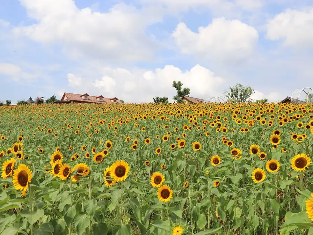 約6,000㎡の花畑(約3,000㎡の花畑2面)に、開花時期を少しずらして咲く合計7万本のひまわり。花畑の中に入ることができるので、たくさんのひまわりに囲まれて写真が撮影できます。