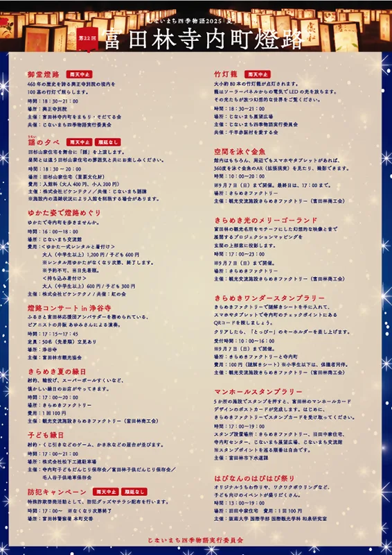 2025年8月23日(土)、歴史的な景観が残る富田林寺内町およびその周辺で、晩夏の風物詩「じないまち四季物語2025『夏』第22回 富田林寺内町燈路」が開催されます。