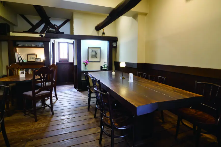 「珈琲 花」は、古民家や古い家具の良質な古材を用いたインテリアが落ち着いた雰囲気を醸していま