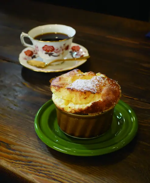 注文してから焼き上げる大人気の手作りスフレをゆっくりと待ちながら、アートブックを眺めたり、会話を楽しんだりするのにぴったりです。