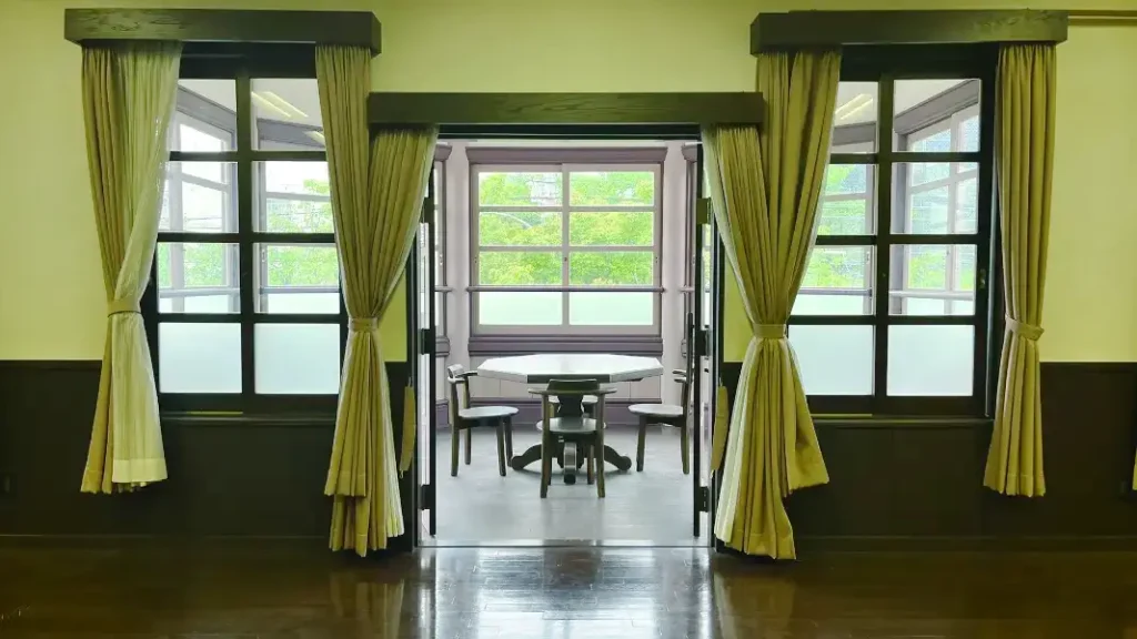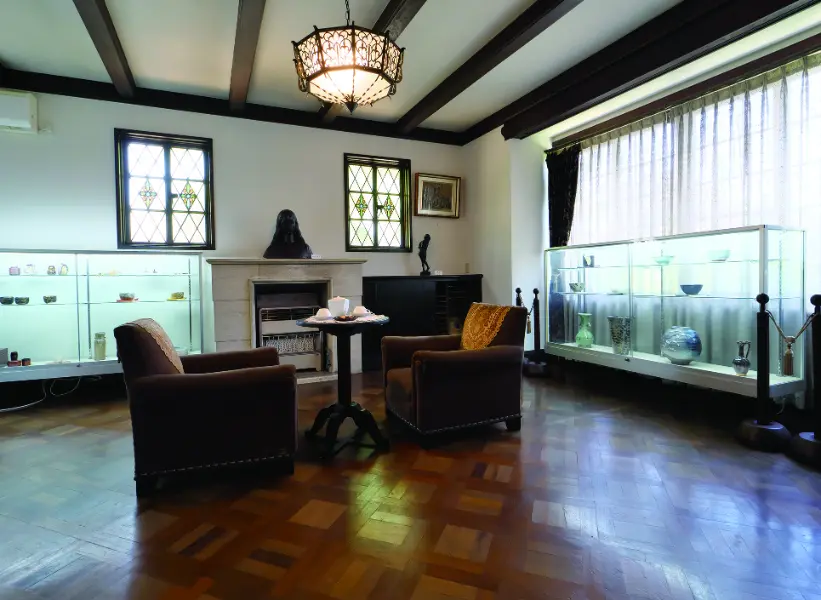 芦屋の山手にある「ヨドコウ迎賓館」は、八代目山邑太左衛門の別邸として大正13(1924)年に建てられました。2階の応接室はシンメトリーなデザインの洋室で、大谷石(おおやいし)のマントルピースが備えられ、大きな窓からは絵画のように景観が望めます。