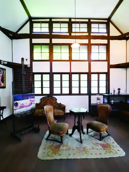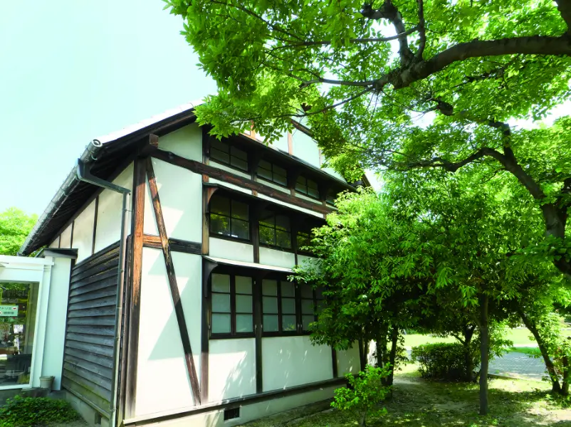 大阪出身の洋画家・小出楢重(こいでならしげ)は、大正15(1926)年に芦屋に転居。翌年、友人の建築家・笹川愼一(ささがわしんいち)設計によるアトリエを建て、多くの名画を残しました。画室には高窓を配し、吹き抜けの壁一面も窓。ヨーロッパの民家を思わせる急勾配の屋根には、日本瓦が使われていて、モダンな洋式と融和しています。